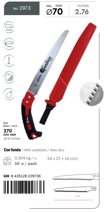 The professional Kamikaze S-270H straight blade saw, with its rubber-coated plastic handle, makes pruning work extremely comfortable, even without wearing gloves. The special curved design of the handle reduces the effort required for cutting so it is easier to prune hardwood.