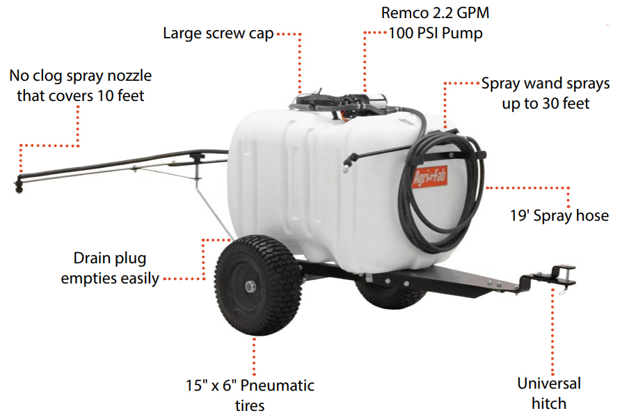 The Agri-Fab 45-0589 45 gallon tow-behind sprayer delivers efficiency, capacity and safety when it comes to applying liquids.