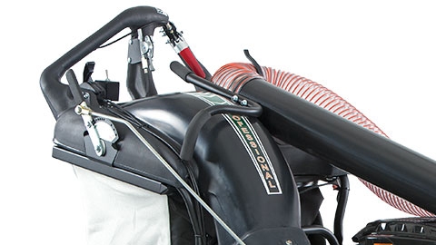 The 74cm (29") wide gobbler door is adjustable from the operator's position for easy switching between hard surface, turf or hose applications. It features a powerful six-blade impeller for maximum suction and debris reduction. The top loading mesh bag has a 151 litre capacity and slides out on rails for easy unloading. The composite housing components are more abrasion-resistant than steel, reduce weight and will not rust or dent.
