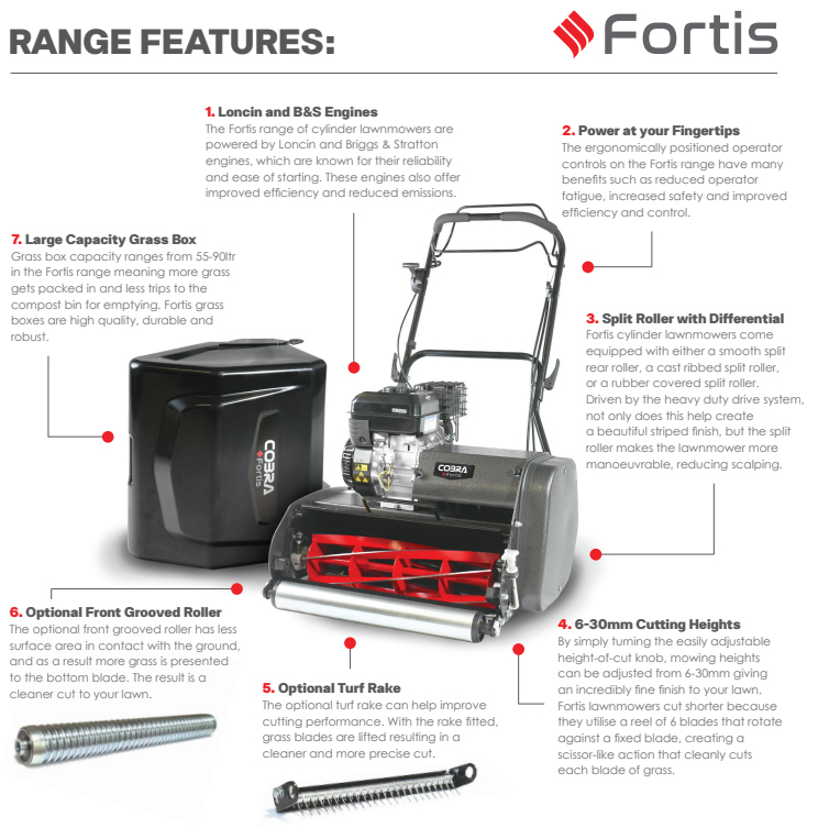 Offering strength and versatility for the serious home gardener and semi-professional alike, the Fortis 25B is the the widest model in Cobra's strong line-up of petrol cylinder mowers.