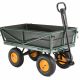 With a 300kg maximum load capacity, the cart features a removable solid plastic liner tray, durable powder-coated frame and a metal loop handle The side panels drop down to convert the trolley into a flad bed trailer, whilst the tipping facility makes unloading more convenient. The pull handle also converts to a tow hitch for use behind a ride-on lawn mower or ATV. With turntable steering to the front wheels, the 13" pneumatic tyres feature roller bearings to allow smooth running over uneven ground.