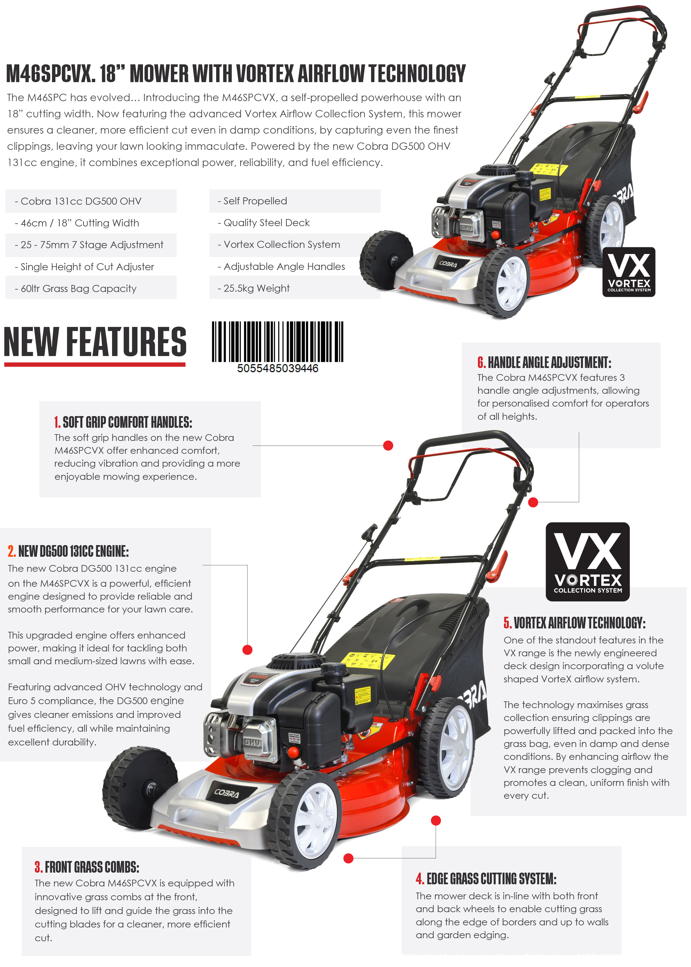 The M46SPCVX incorporates the latest engine design technology in the form of a 131cc Cobra DG500 Series engine, which delivers easy starting, energy efficiency, impressive power and unwavering reliability for effortless mowing.