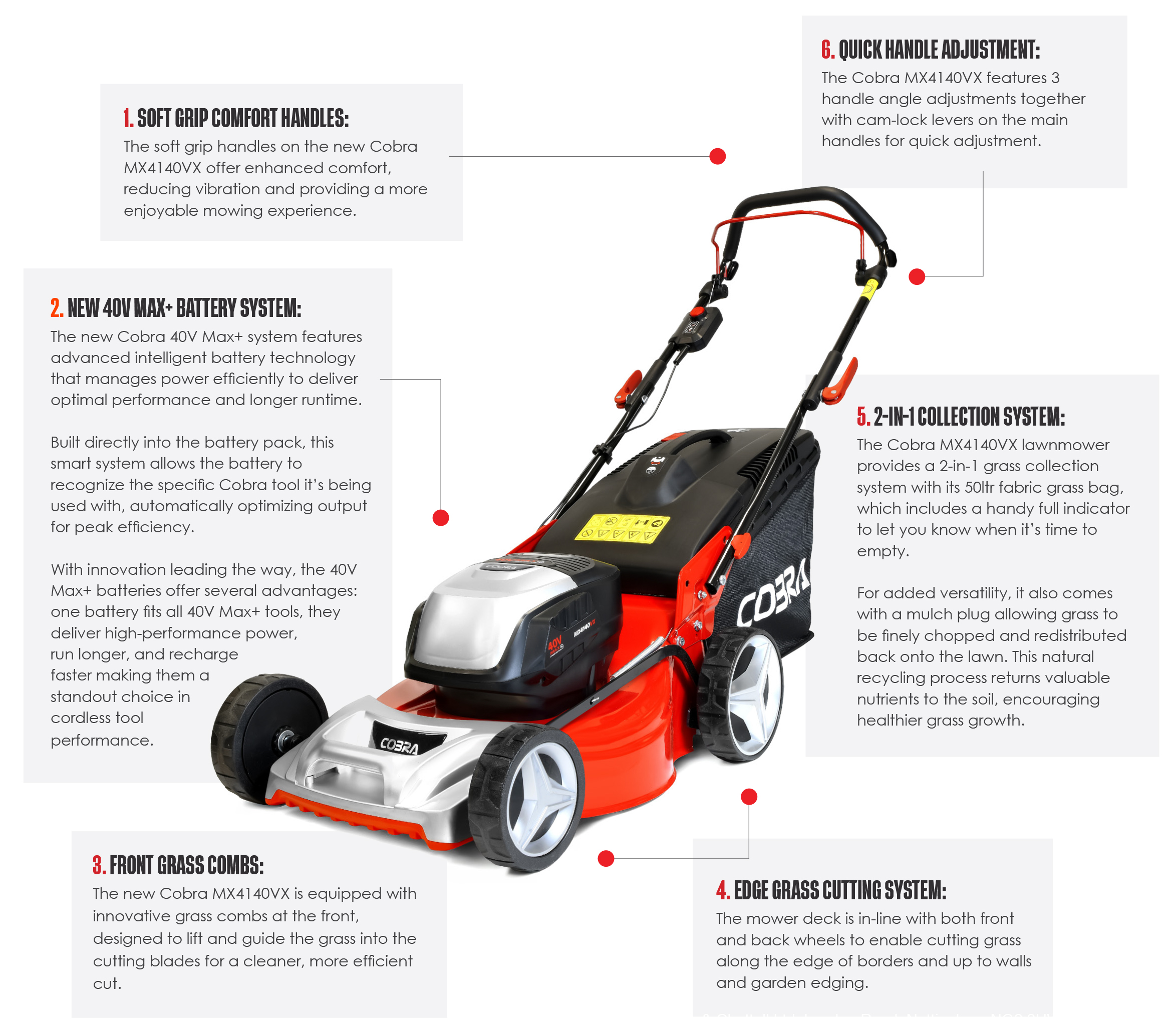 This mower is exclusively compatible with Cobra's 2nd Generation 40V MAX+ range introduced in 2025.