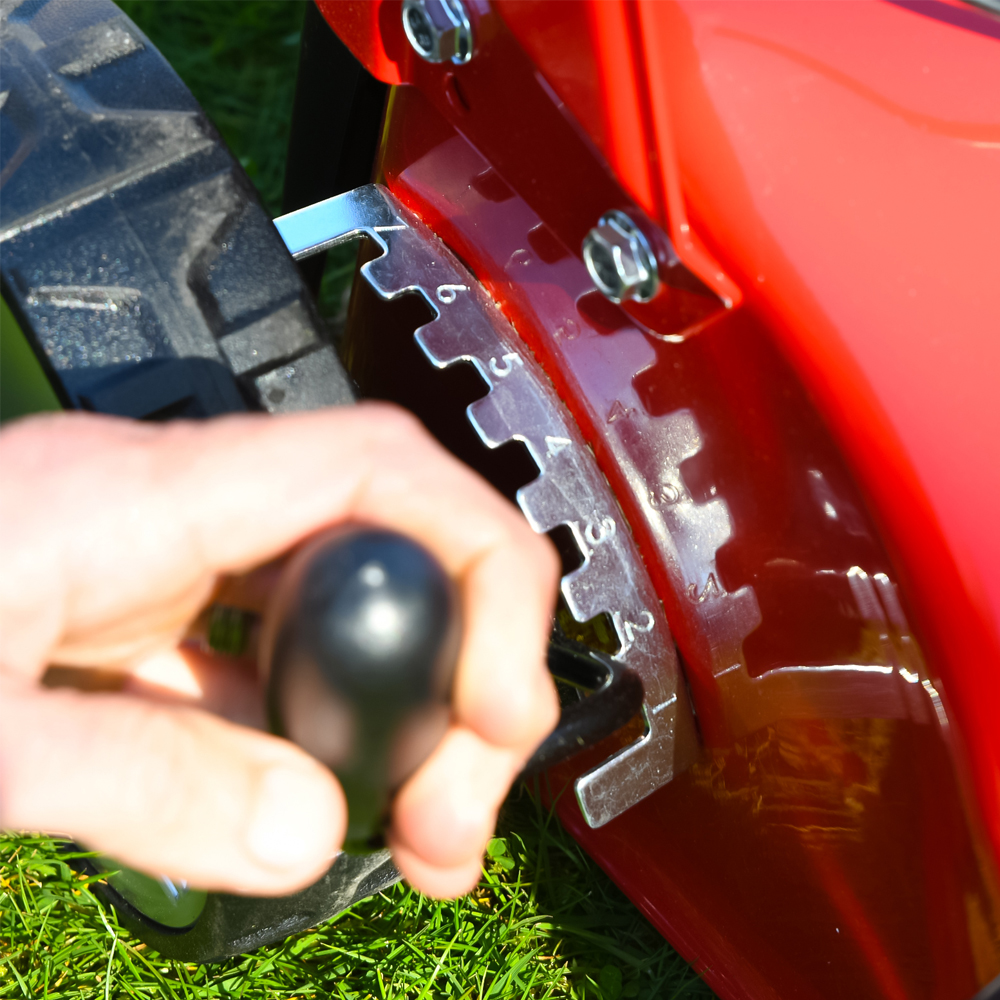 A robust 46cm (19") steel cutter deck features seven fully adjustable cutting heights which range from 25mm for a low finish, up to 75mm for tackling longer grass. Raising and lowering the deck is achieved by simply using the single height of cut adjustment lever which has been conveniently positioned next to the rear wheel so you can set the mower up according to mowing conditions.