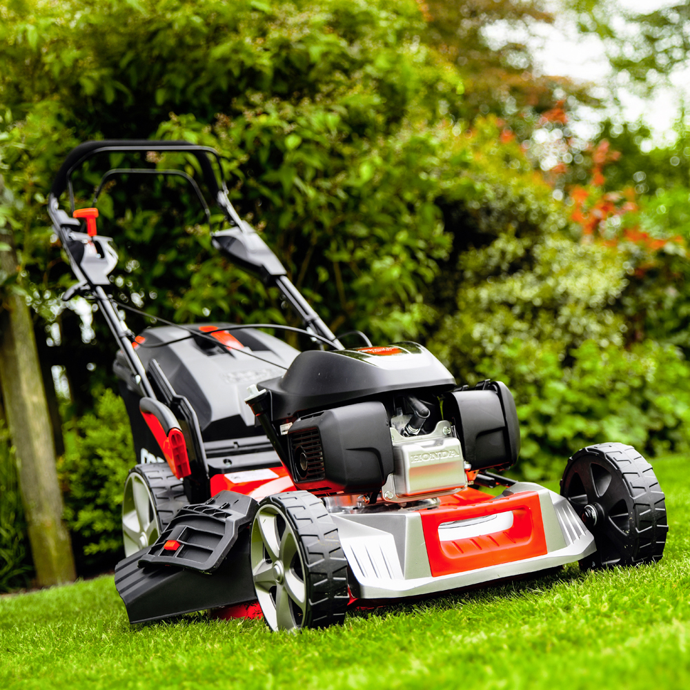 The lawn mower is self-propelled with four-speed gearbox which enables you to set the pace and to tackle larger areas or thicker patches of grass with minimal effort. Combined with the extra large rear wheels, you'll be in total control of the mower on slopes and undulating ground, and the mower is highly manoeuvrable, allowing you to cut safely around obstacles in the lawn.