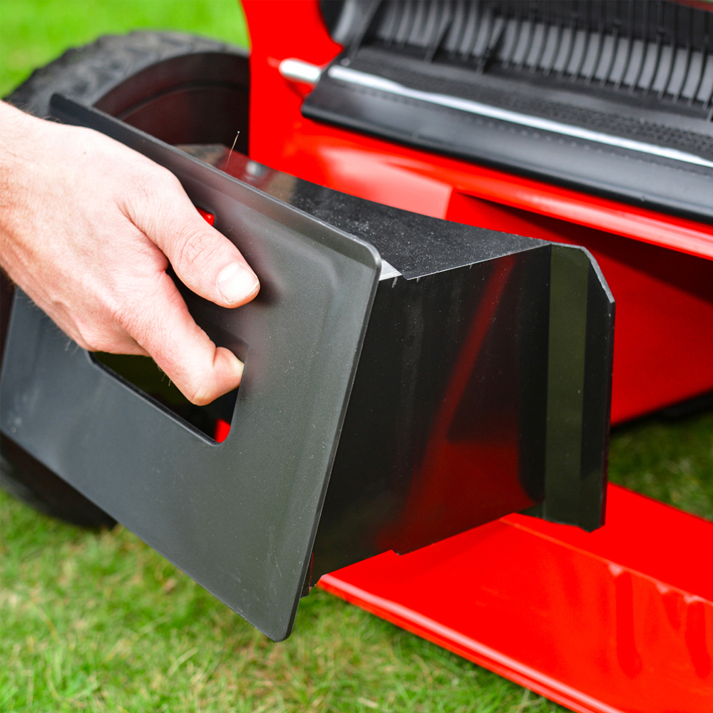 If you don't want to collect your grass cuttings or your lawn has become overgrown, the mower comes equipped with a side discharge function. Simply lift the side blanking plate and insert the side discharge chute. The grass will now be discharged in neat lines to the side of where you are mowing.