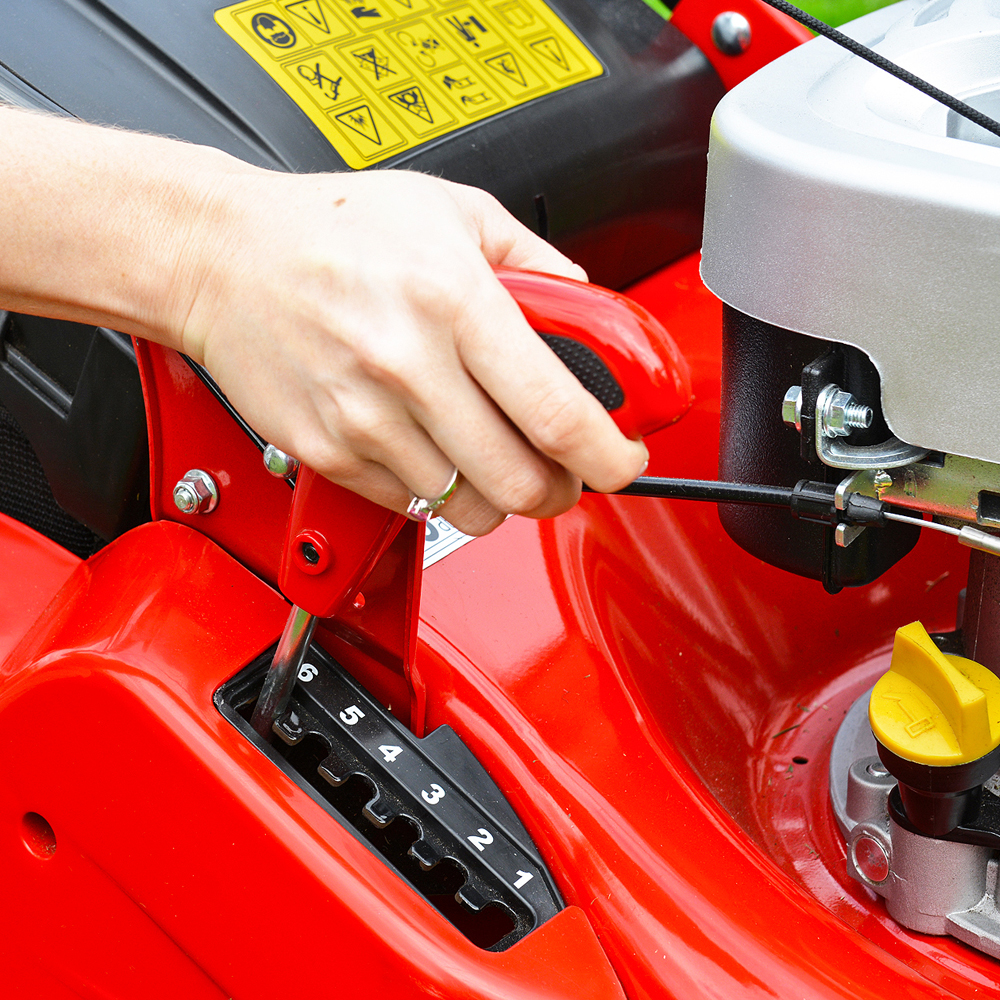 17-75mm cutting heightsWith a fully adjustable six cutting heights ranging from 17mm for a superb low finish, up to 75mm for tackling longer grass, choose the Cobra RM433SPBI. All this is achieved by simply using the single height of cut adjustment lever |