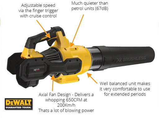 The DCMBA572 features a high efficiency brushless motor which combines with the axial fan to produce up to 650cfm air volume and a blow speed up of to 200km/h (125mph).