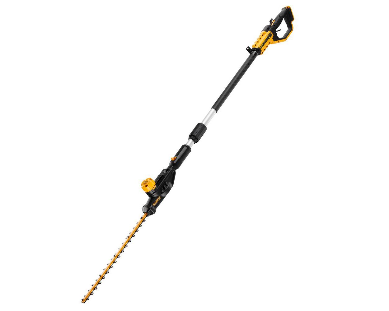 High power and exceptional battery life are just two of the advantages of the DeWalt DCMPH566 battery-powered pole hedge trimmer.