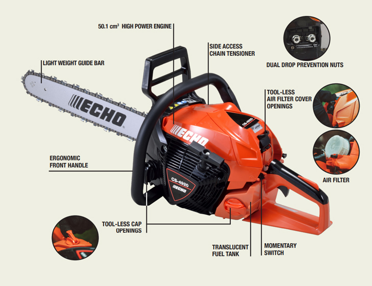 The Echo CS-4920 is a heavier duty version of the CS-4910 chainsaw. It features a 50.1cc professional-grade two-stroke, stratified scavenging engine that provides more power and less emissions than any other saw in the same class.