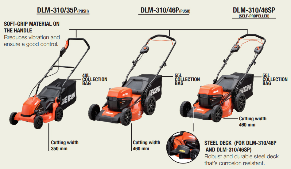 The Echo DLM-310/46SP is the top-of-the-range battery-powered 40V lawn mower in the Garden+ Series and built for the enthusiastic domestic user. Features have been developed specifically for ease of use and power to make mowing your lawn a pleasure.