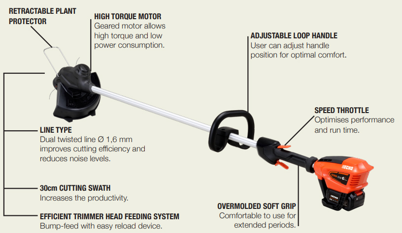 The Echo DSRM-310L is part of the battery-powered 40V Garden+ series and built for the enthusiastic domestic user. Features have been developed specifically for ease of use and power enabling the grass trimmer to perfectly trim those difficult to reach areas of your garden.