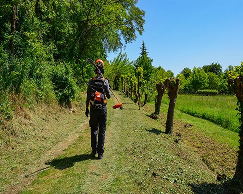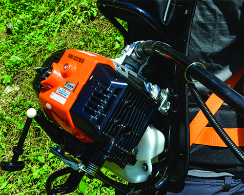 The backpack design supports the engine's weight and allows for a robust anti-vibration system. This design is ideal for use on varying terrain such as banks, hills, steep slopes and other difficult-to-reach areas. The RM-520ES offers more manoevrability, power and comfort and less fatigue.