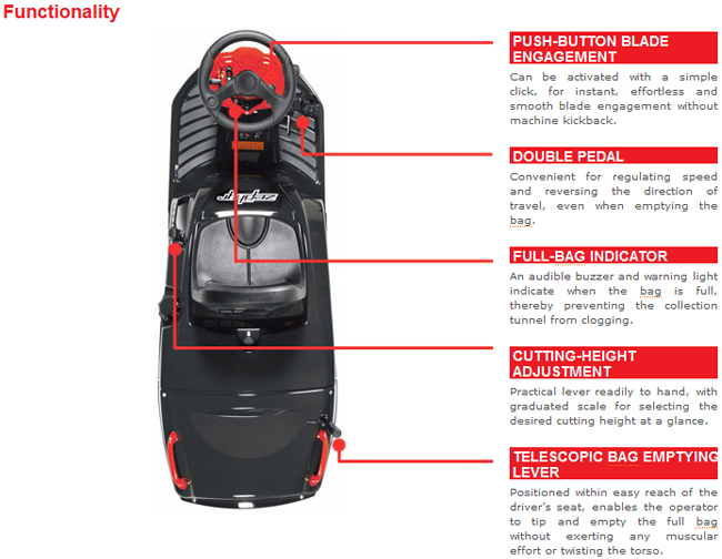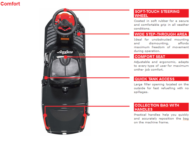 and empty the full bag effortlessly and without twisting the body. - Tight turning radius aids manoeuvring and cutting, even in confined areas.