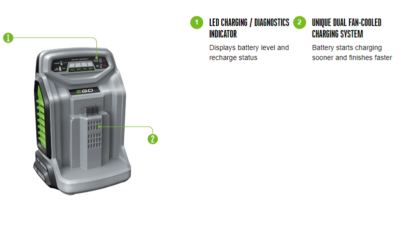 Compatible with all batteries in the EGO Power+ garden equipment range, this 56 volt lithium-ion infinity charger is the industry's fastest, charging in 30 minutes or less.