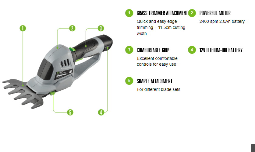 The shrubber features 20cm reciprocating, double-sided blades with 8mm blade gap which make it ideal for jobs requiring meticulous attention to detail on hedges and shrubs. The 11.5cm grass shear blade will achieve precise trimming of lawn edges. The blades can be quickly exchanged at the touch of a button and run at 2400 cuts per minute to deliver an extremely clean cut.