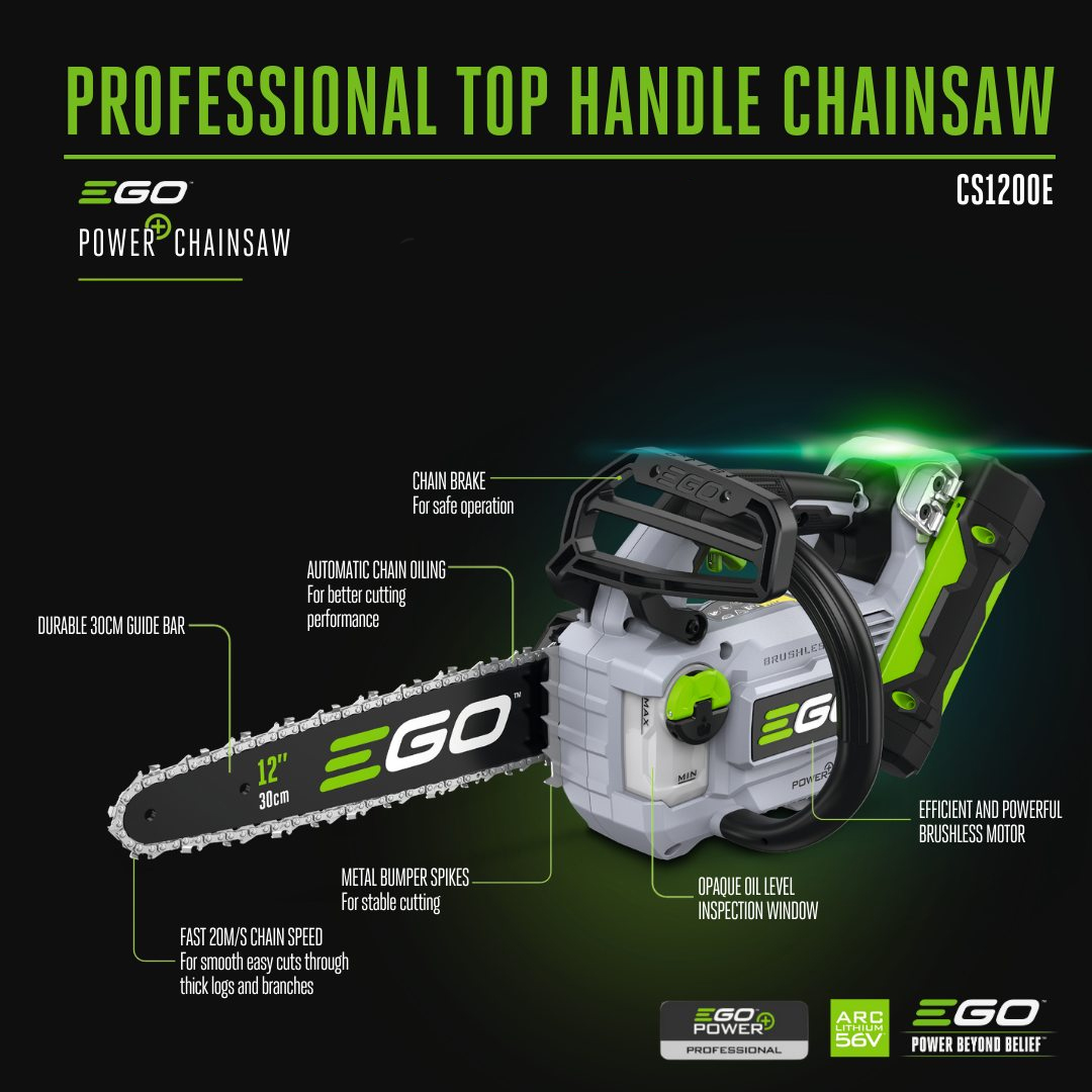 The EGO Power+ CS1200E 56V top handle chainsaw is the perfect tool to simplify work for tree-care professionals.