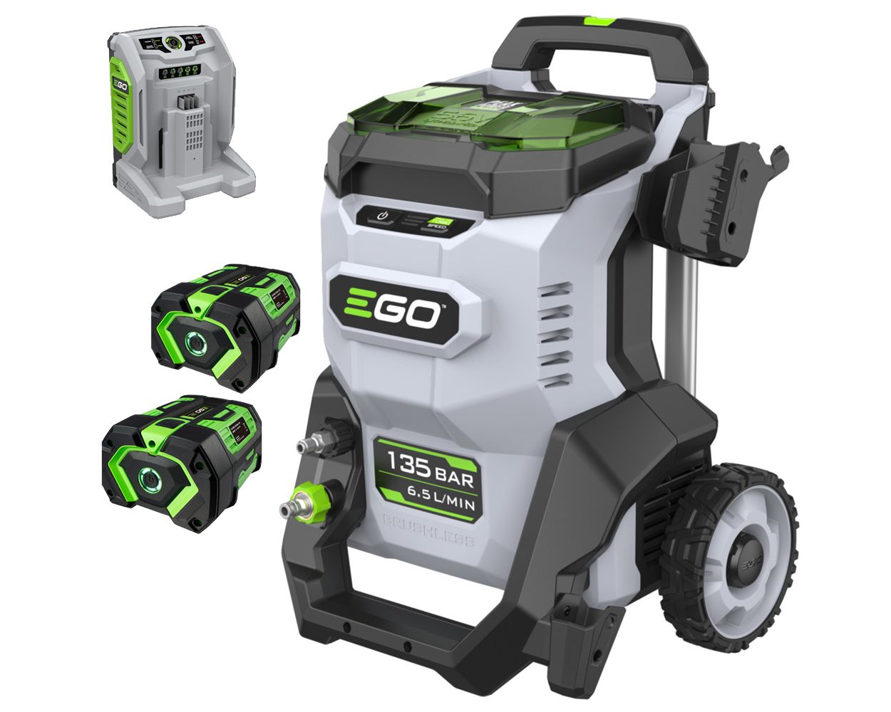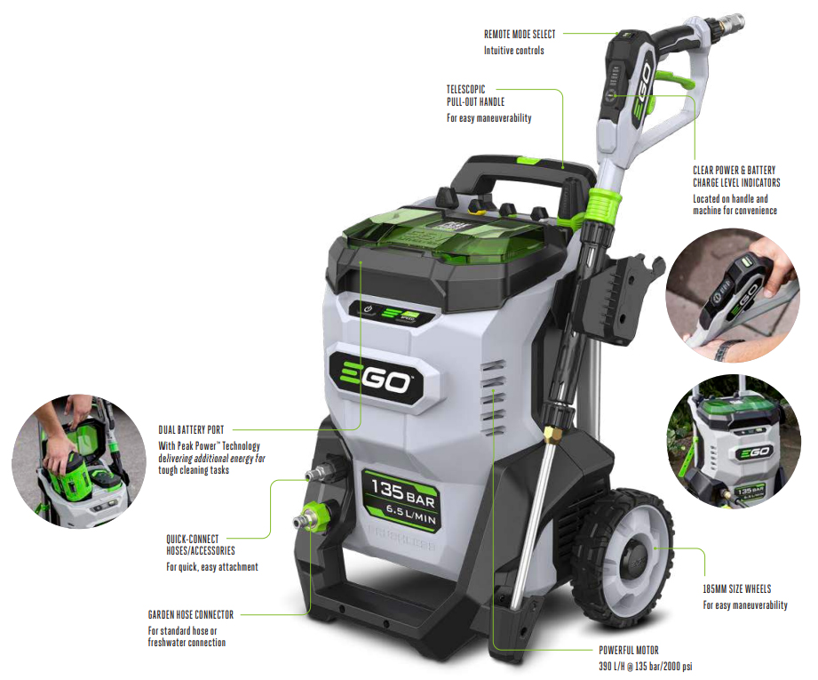 The EGO Power+ HPW2000E pressure washer offers heavy-duty cleaning power with remote information display and power control, dual battery port with Peak Power™ technology for market-leading battery run times, premium hose fittings and the inclusion of five nozzles for a variety of different cleaning tasks.