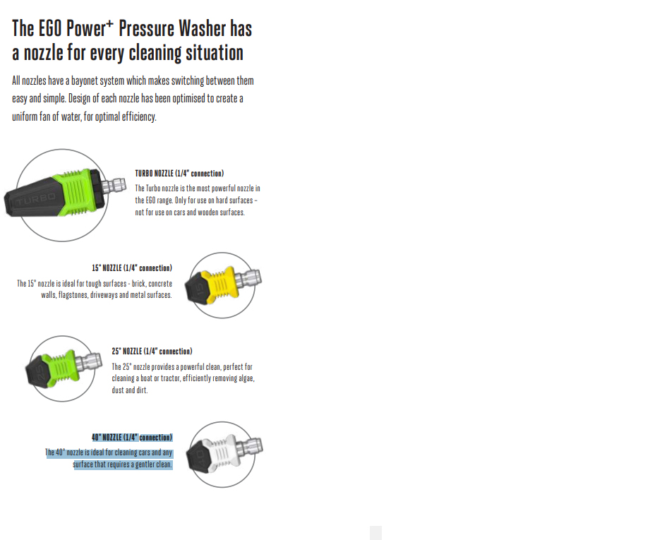 The turbo nozzle is the most powerful nozzle in the EGO range. Only for use on hard surfaces – not for use on cars and wooden surfaces.