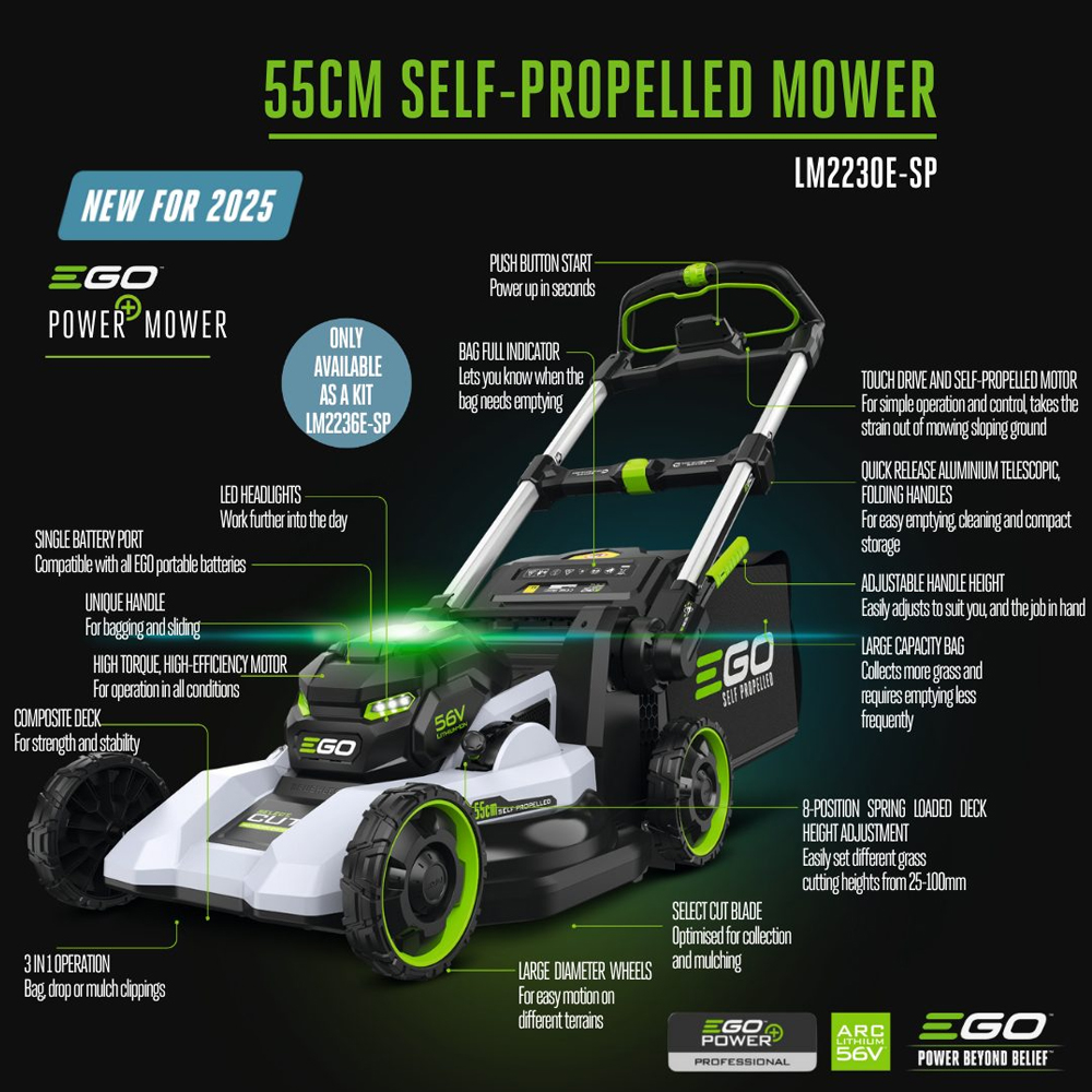 You can be sure of a seamless mowing experience with the LM2230E-SP, which takes you to the peak of the Professional range from cordless specialists EGO Power+. Equipped with a wide 55cm cutting capacity, this 56V battery-powered lawn mower is ideal for precision mowing of sizeable gardens and larger spaces.