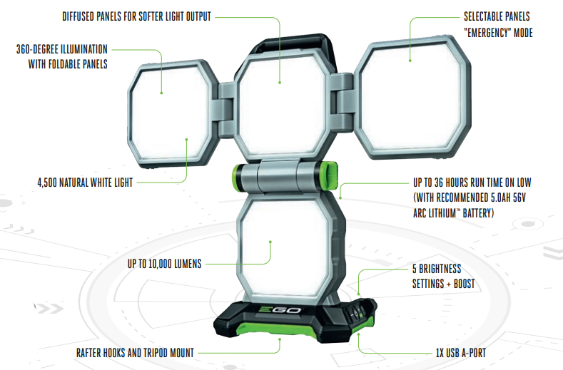 Complete with five brightness settings, foldable panels, easy transportation and storage, the EGO Power+ portable area light is suitable for everything from mood lighting to task lighting.