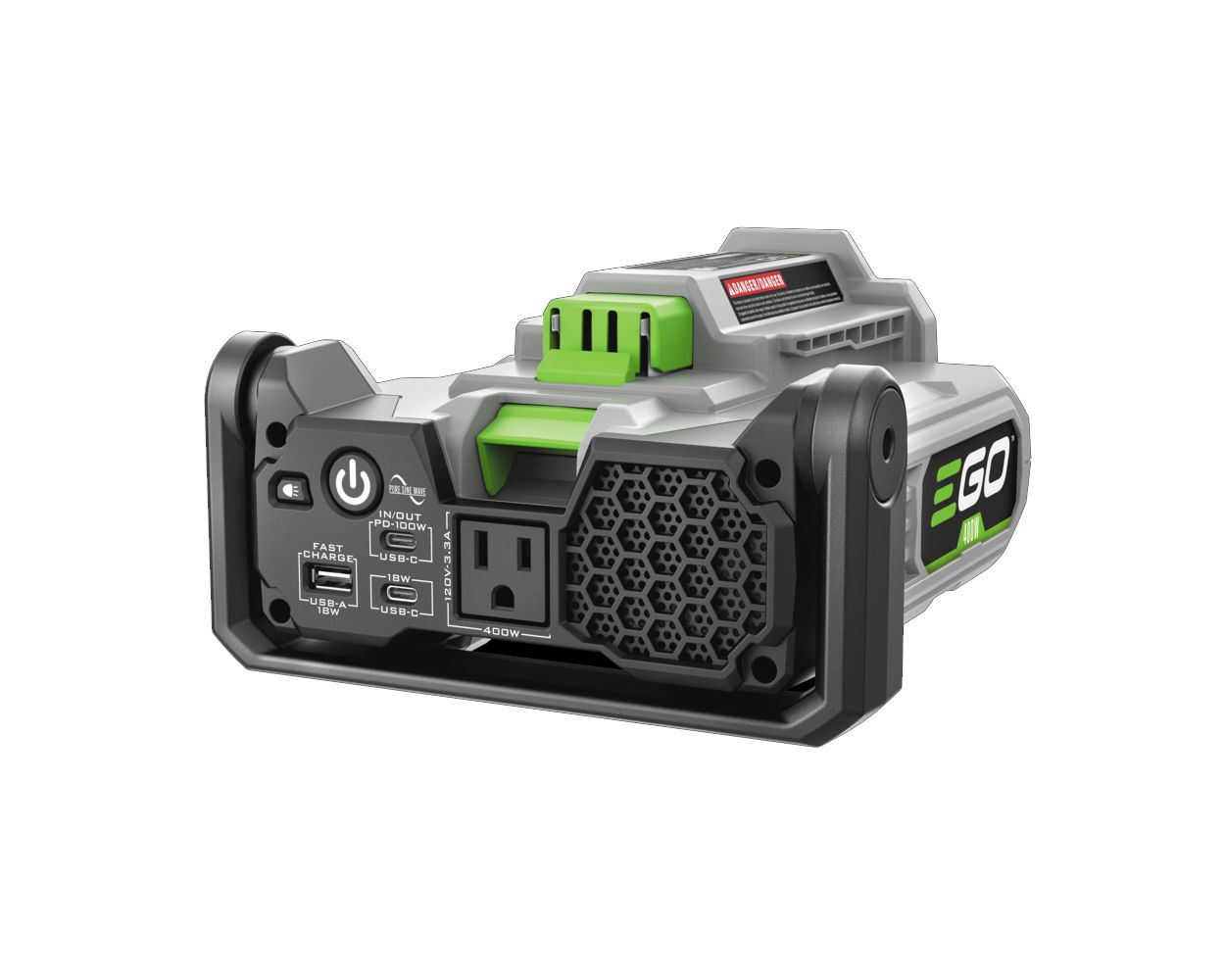 The power inverter provides 400 watts of continuous power and 800-watt peak power for devices requiring additional ramp-up power. It can power up to three USB-compatible devices simultaneously via one USB-C port, one USB-C PD port, and one USB-A port. It delivers up to 100 watts of power with the USB-C PD port for the ability to power larger devices like laptops or charge your EGO 56V ARC Lithium™ batteries (available separately).