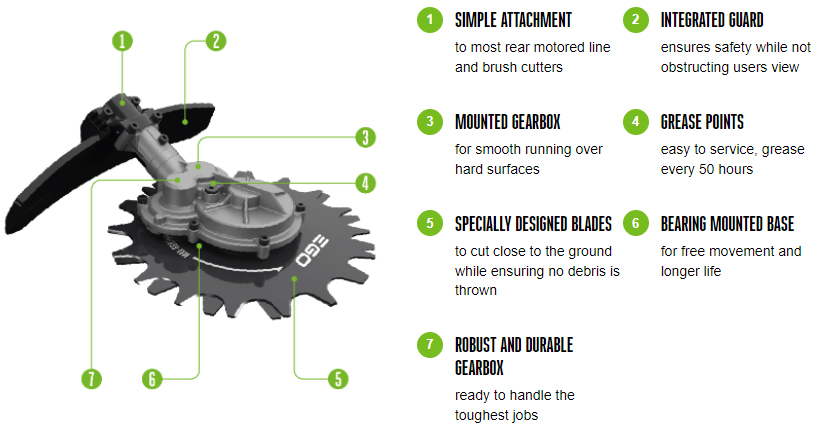 Rotocut’s flat design and simple attachment process means it can also fit to most rear motor brush cutters and line trimmers on the market.