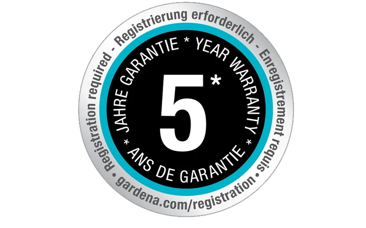 Five year Gardena warranty after registrationAfter registration at gardena.com/registration within three months of purchase. |