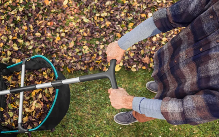 The GARDENA leaf and grass collector works like a mechanical rake and is therefore environmentally-friendly. The rotating brushes are driven by the wheels. Solid objects such as acorns, chestnuts, fruit etc. are not collected. The leaf and grass collector is only partially suitable for foliage with stems and large leaves (e.g. chestnut) as these may get caught in the brushes. When collecting leaves on paved paths or tarmac, it may be necessary to go over the area multiple times.