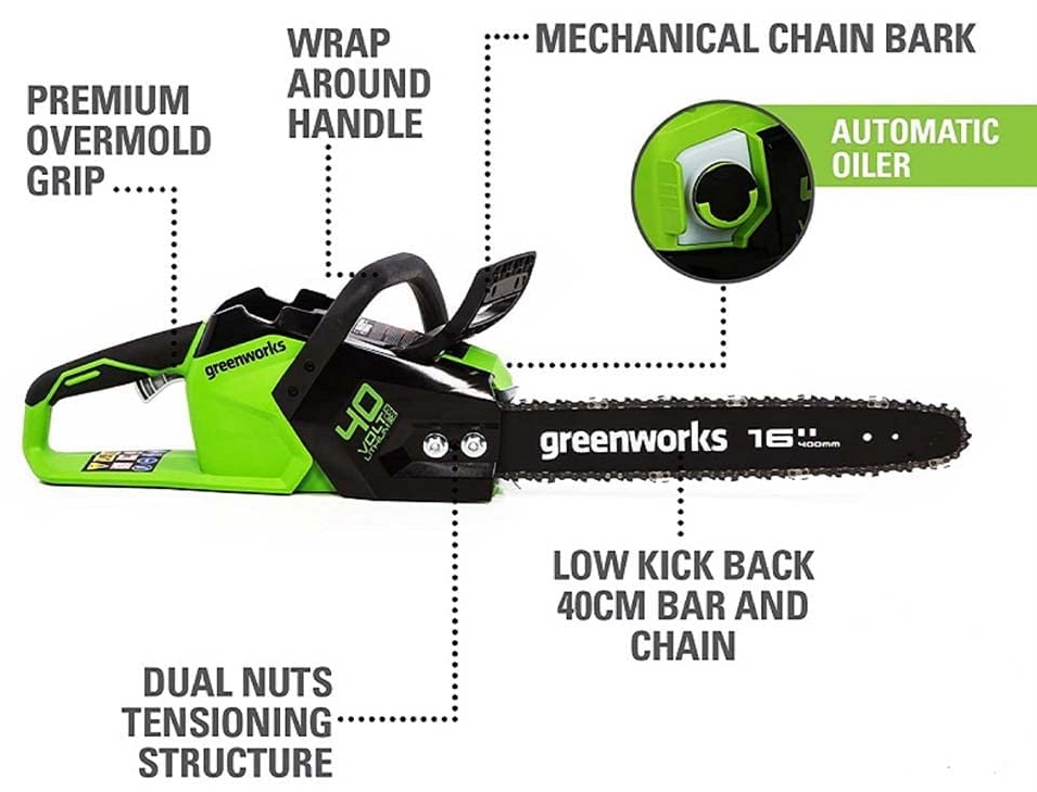 Equipped with a powerful DigiPro brushless motor, 40cm guide bar and impressive chain speed of 20m/s, the GreenWorks GD40CS18 is the ideal domestic chainsaw for pruning branches and cutting logs and smaller trees effortlessly.