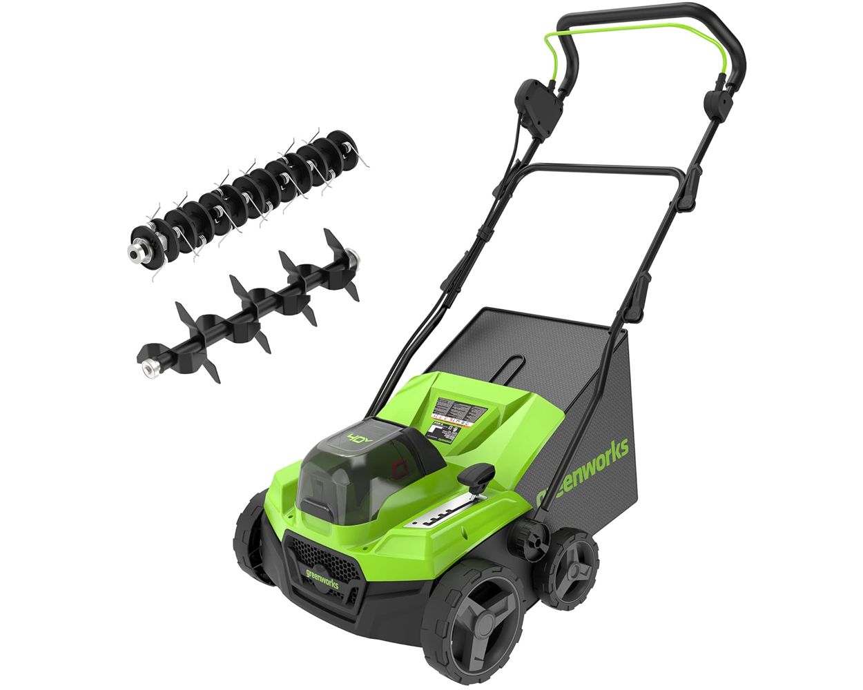 The 2-in-1 GreenWorks GD40SC38 lawn scarifier and dethatcher is designed to ventilate the soil enabling the grass roots to breathe again so that water, air and nutrients can infiltrate the turf for a greener, denser lawn. The machine utilises two different cassettes which be easily interchanged without the use of tools.