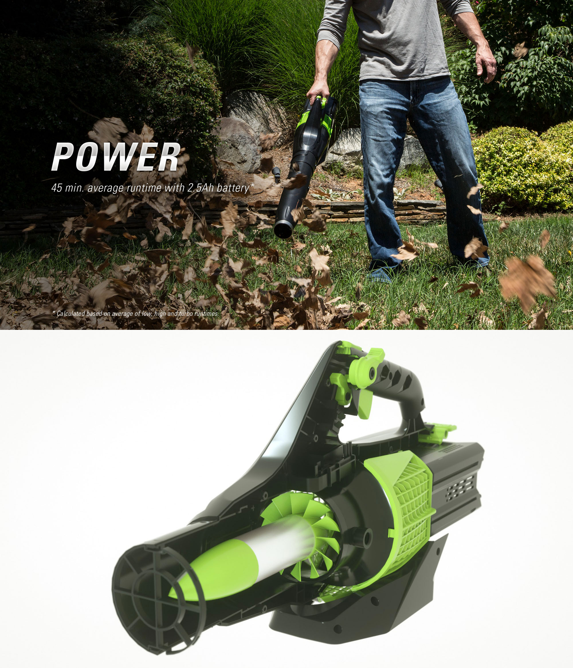 Powering the unit is a beefy 60 volt lithium-ion battery (not supplied) with the convenience of push button start. The blower produces a forceful 225km/h (140mph) air speed to blast leaves, grass clippings, pebbles and sand into tidy, manageable piles. The axial fan is inspired by a jet engine and unleashes a torrent of 450cfm air flow. While the side-mounted intake fans on petrol or electric models pull air through a 90 degree turn before forcing it out, the GreenWorks axial blower has a linear intake whereby air is gulped in through the back, twisted by the internal fins to increase power, then pushed straight out through the nozzle.