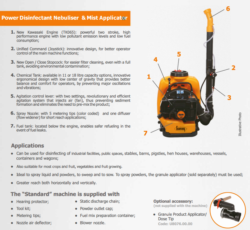 An 11 litre motor-powered backpack nebuliser with a Kawasaki engine that produces a powerful, directed fog of finely atomised disinfectant or other liquid or powder product 18 metres horizontally and 12 metres vertically.
