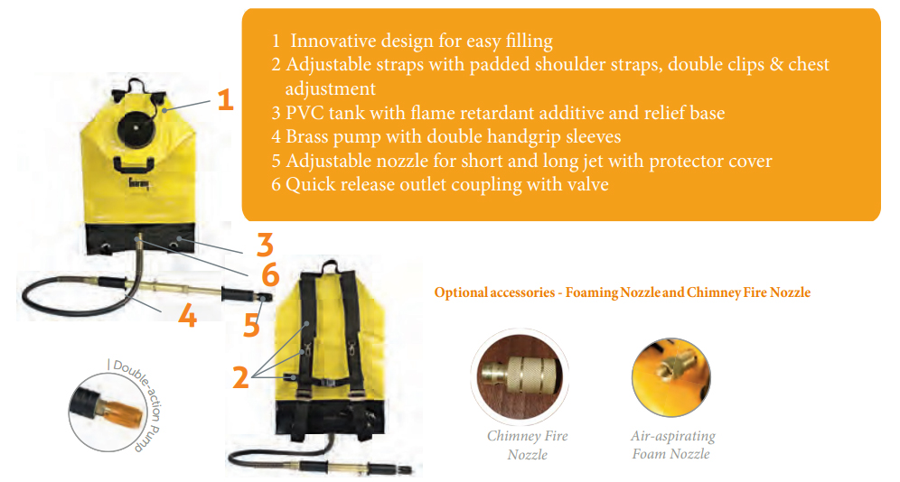 This backpack fire extinguisher from Guarany is standard issue kit for most of the UK’s fire brigades for tackling small fires or fires that can not be reached by main tender fire engines.