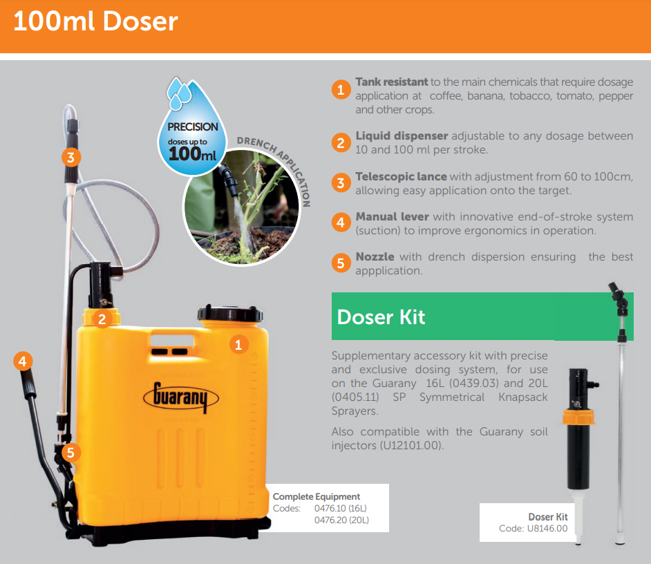 The 100ml doser can be bought with a Guarany backpack as a complete kit (pictured) or can be used with the Guarany 20 litre knapsack sprayers and soil injectors.
