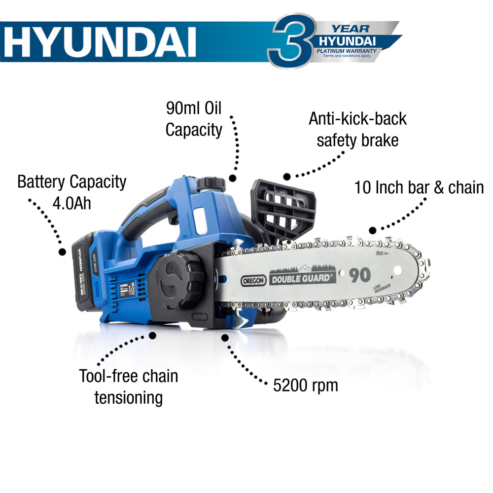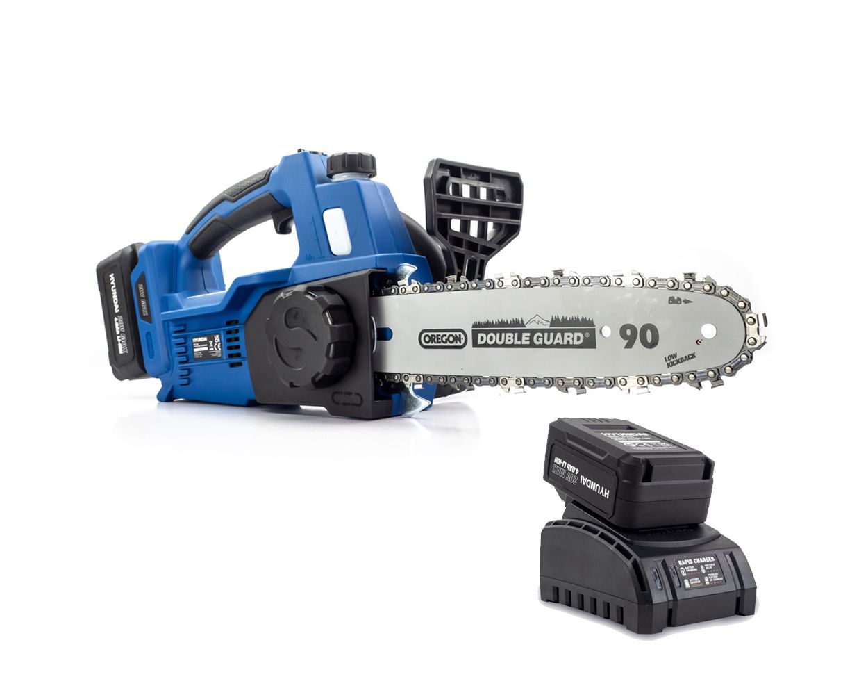 The HY2190 is a lightweight cordless chainsaw from Hyundai, forming part of its extensive 20V MAX range of power tools and garden machinery. This chainsaw has a brushless motor, enabling the motor to run for longer with more efficiency than brushed motors. Powered by a 20V MAX lithium-ion 4 Amp-hour battery, this is the ideal chainsaw for smaller woodcutting tasks including felling small trees and chopping logs for wood burners.