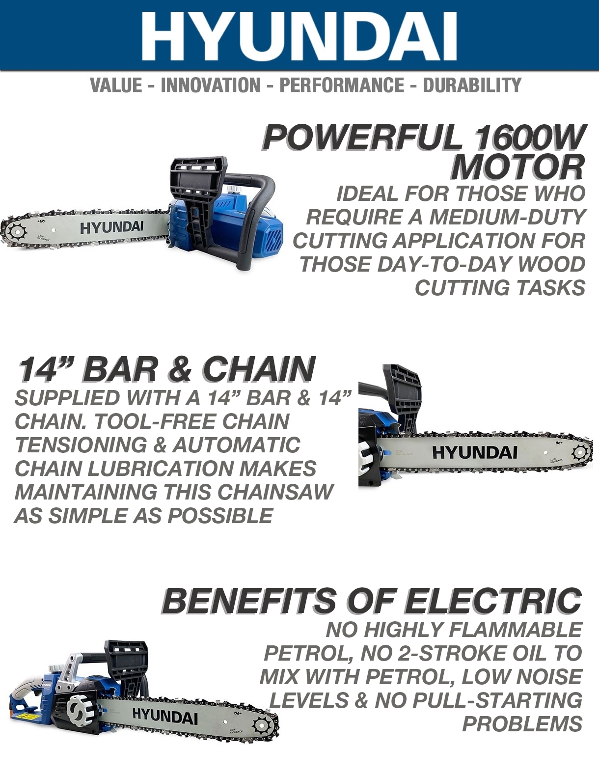 A lightweight electric chainsaw from Hyundai, the HYC1600E is ideal for homeowners who require a medium-duty cutting tool for those day-to-day woodcutting tasks.