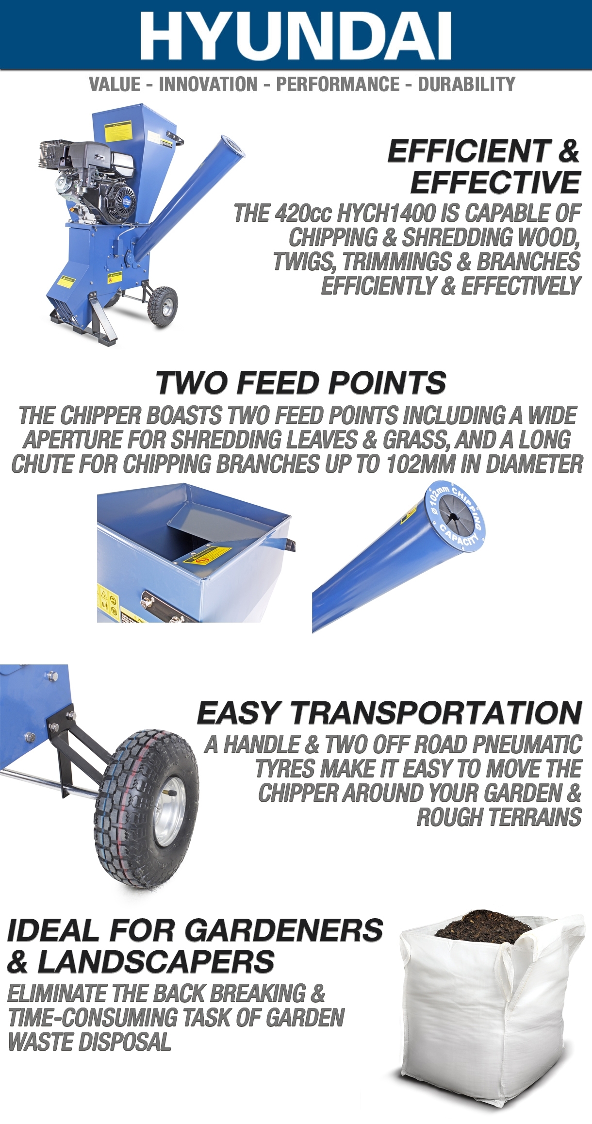 The HYCH1400 is a compact wood chipper from Hyundai, powered by a 402cc / 14hp OHV four-stroke unleaded petrol Hyundai engine. The HYCH1400 is capable of chipping / shredding wood, twigs, trimmings and branches efficiently and effectively.