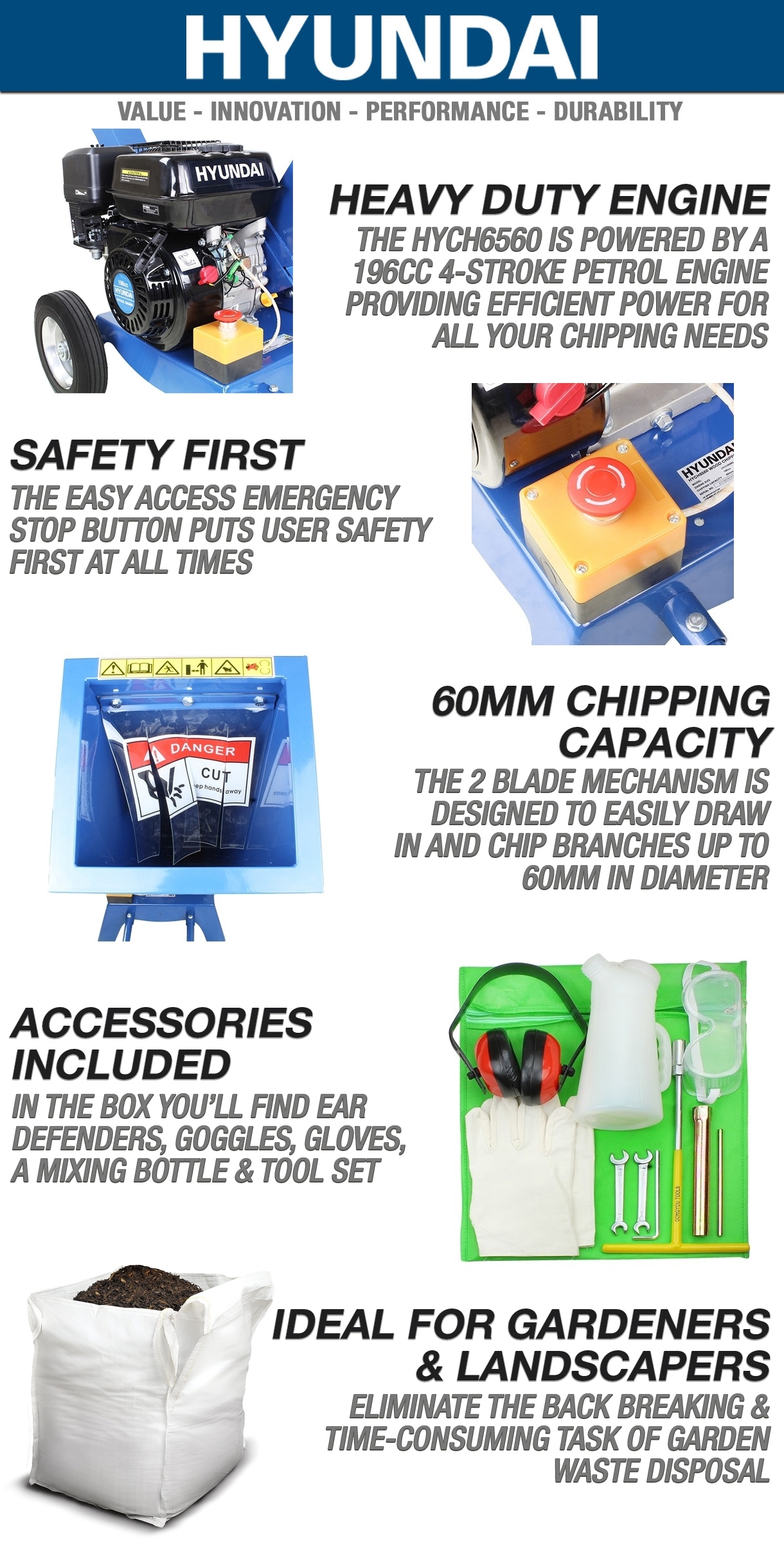 Suitable for serious gardeners, landscapers to amateur gardeners the HYCH6560 ensures you will never struggle with back breaking and time consuming chipping garden waste disposal again.