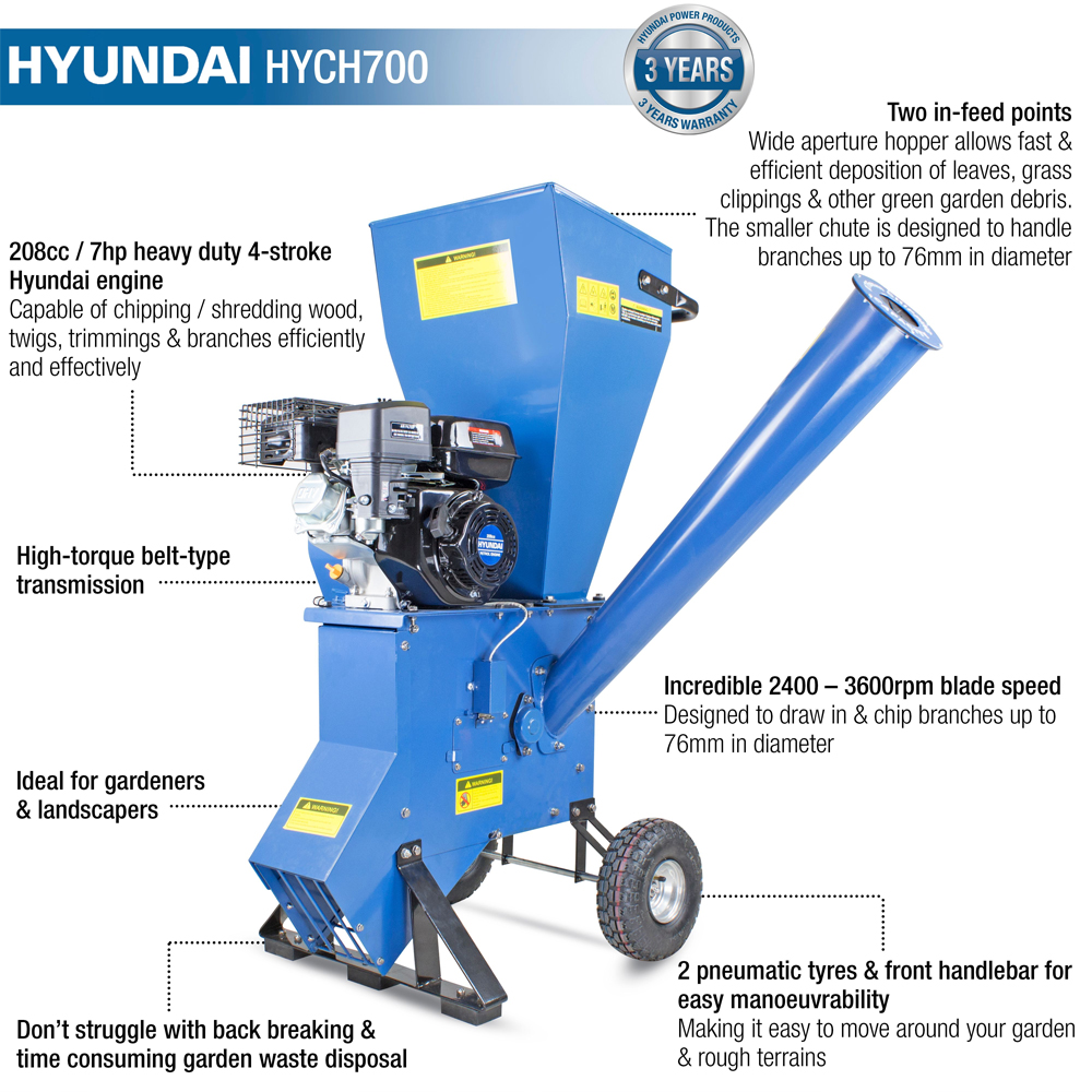 Powered by a heavy-duty 208cc / 7hp four-stroke OHV Hyundai engine, it will provide you with a powerful performance, transforming piles of garden waste into manageable compostable material. The HYCH700 is capable of chipping and shredding wood, twigs, trimmings and branches into easily-handled chippings quickly and effortlessly.