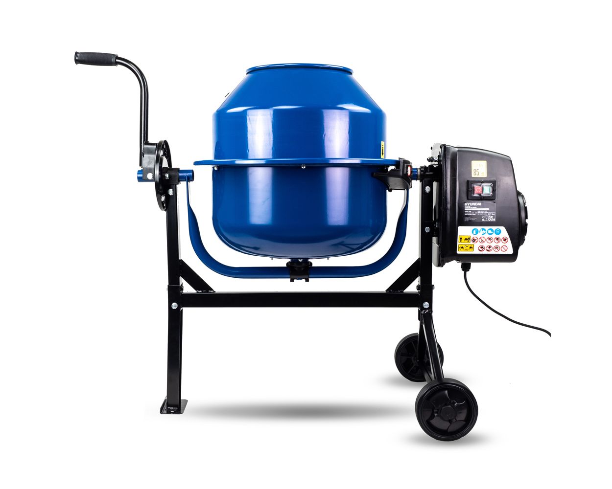 The HYCM63E is a small concrete mixer that has been designed to operate at wheelbarrow working height for optimum comfort and ease. This Hyundai portable concrete mixer is mounted on a strong and robust, free-standing steel frame and its two puncture-proof wheels make moving this 25.5kg mixer between tasks across a range of terrains easy.