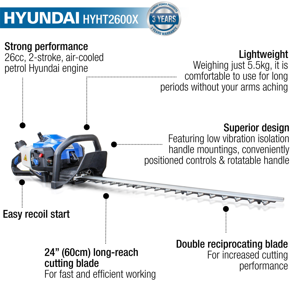 With its powerful and reliable 26cc two-stroke air-cooled petrol engine, the Hyundai HYHT2600X is ideal for both domestic and semi-professional use, boasting a fantastic power to weight ratio and offering good mid-range torque and increased fuel efficiency.