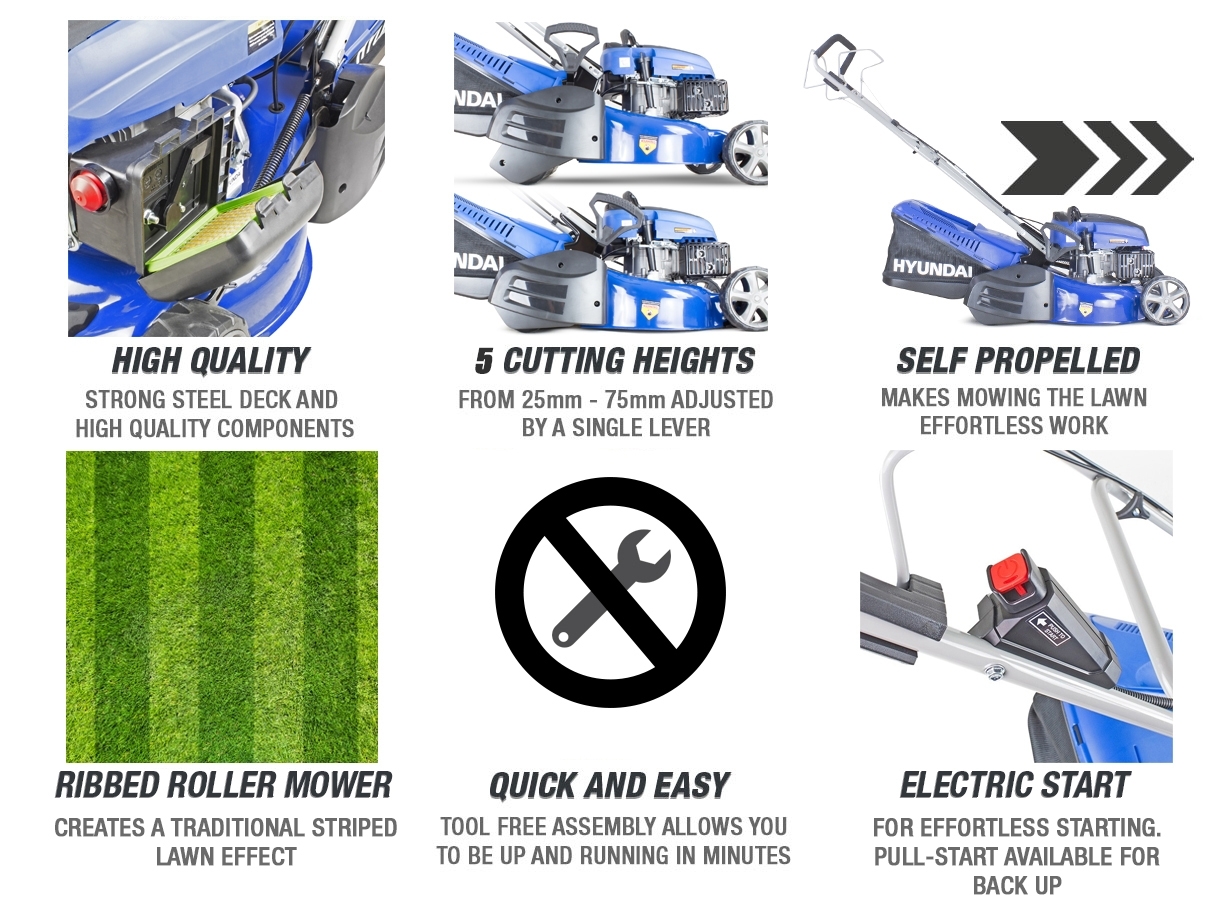 Specifically designed to create stripes on your lawn, the Hyundai HYM430SPER is a feature-packed self-propelled, electric starting petrol lawn mower ideal for small to medium domestic lawns.