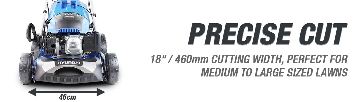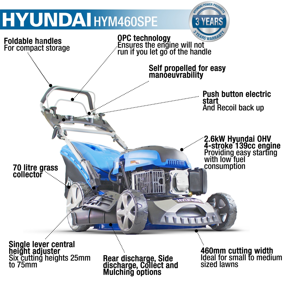 The HYM460SPE lawn mower from Hyundai benefits from push button start, self-propelled RWD (rear wheel drive) and is powered by the Hyundai IC140VE 139cc OHV four-stroke Euro 2 low emission, low maintenance fuel efficient petrol engine.
