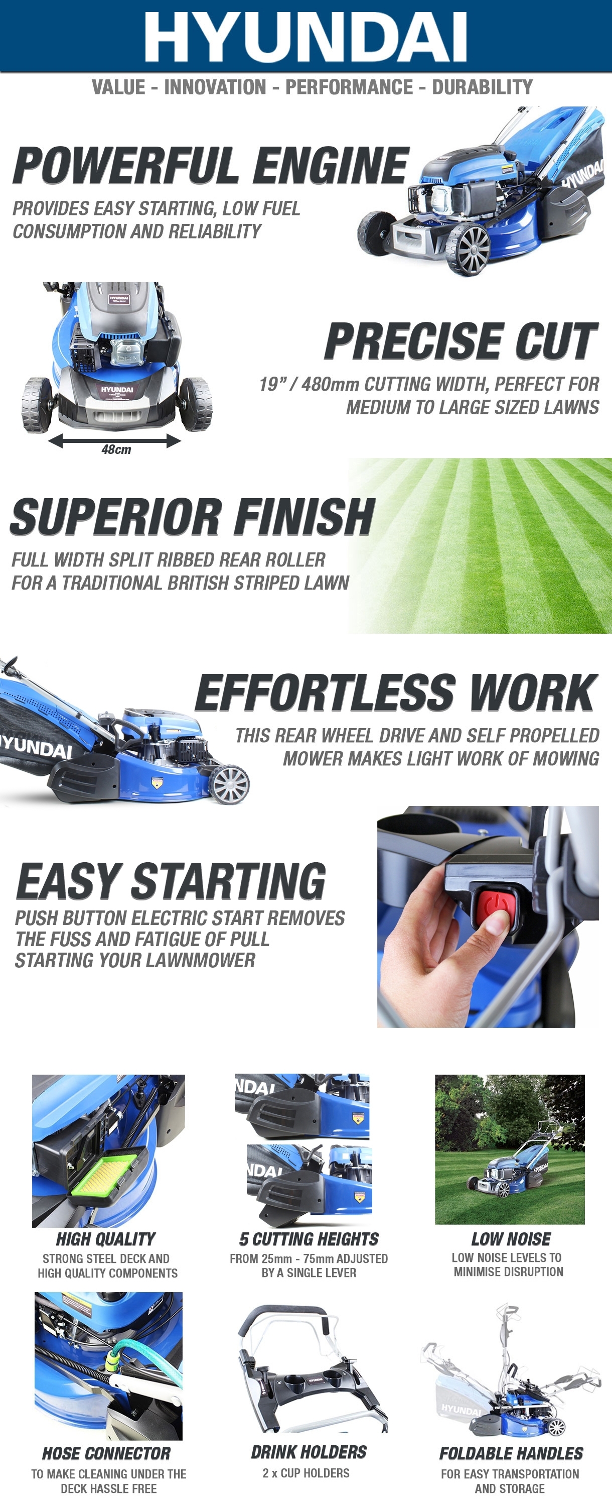 Powering the rear wheel drive lawn mower is an easy-starting 139cc Hyundai 4-stroke engine with overhead valve technology, low noise levels and low fuel consumption to keep running costs to a minimum. The convenient push button electric start removes the fuss and effort of pull starting your lawn mower, with recoil start as back-up.