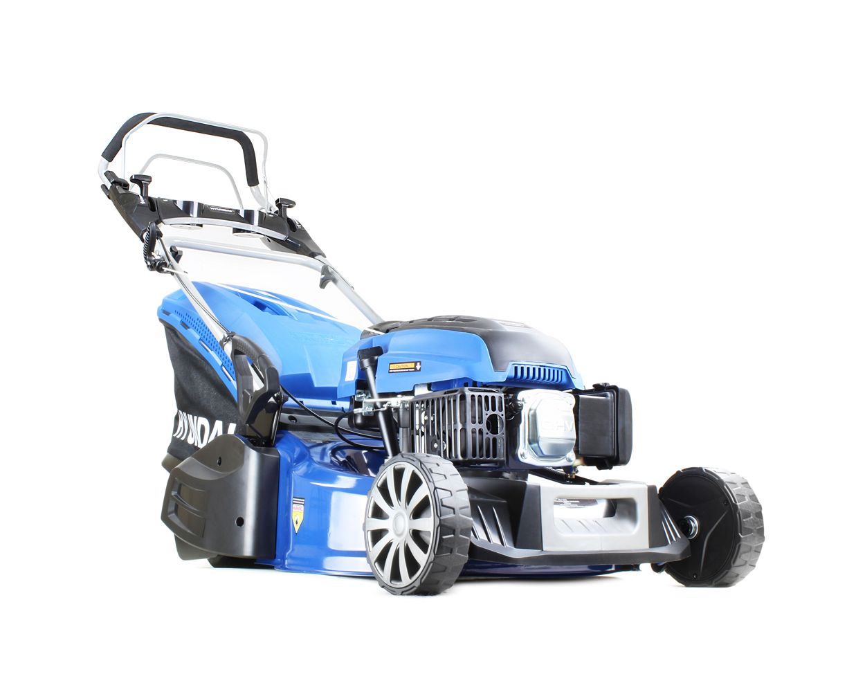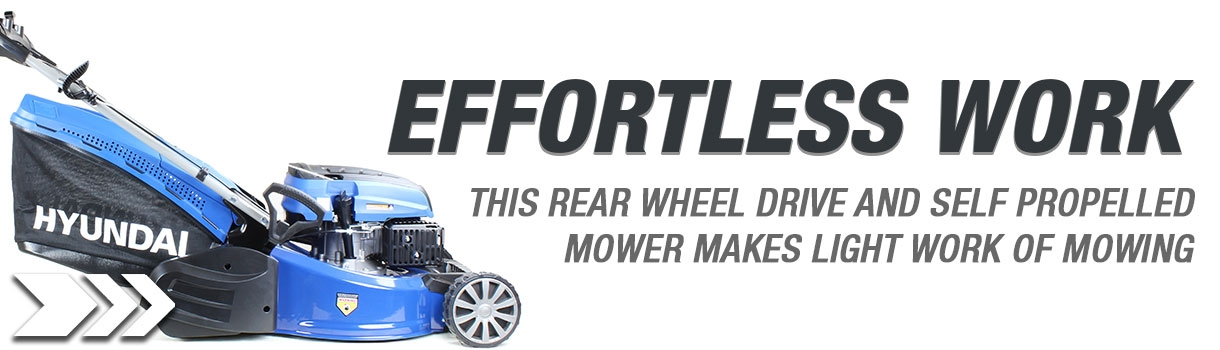 Powering the rear wheel drive lawn mower is a recoil-starting 139cc Hyundai four-stroke engine with overhead valve technology, low noise levels and low fuel consumption to keep running costs to a minimum.