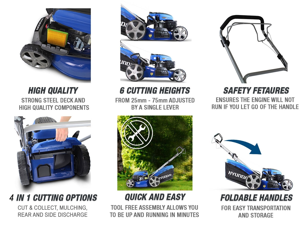 The Hyundai HYM510SP lawn mower is a versatile 4-in-1 self-propelled rotary lawn mower powered by a Hyundai IC200V 196cc OHV four-stroke Euro 5 low emission, low maintenance and extremely economical petrol engine. With tool-free assembly, you can be up and running in minutes.