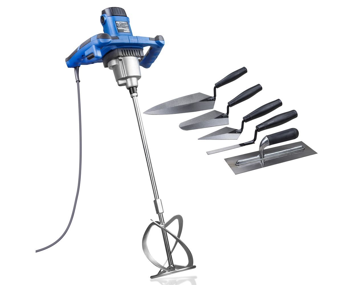 The HYPM1600E is a powerful, high-torque 1600W corded electric paddle mixer from Hyundai which comes complete with a five-piece trowel set, ideal for quick, effortless and convenient mixing of paint, plaster, gypsum, adhesive, mortar, small buckets of cement, and other mid-viscosity liquids.