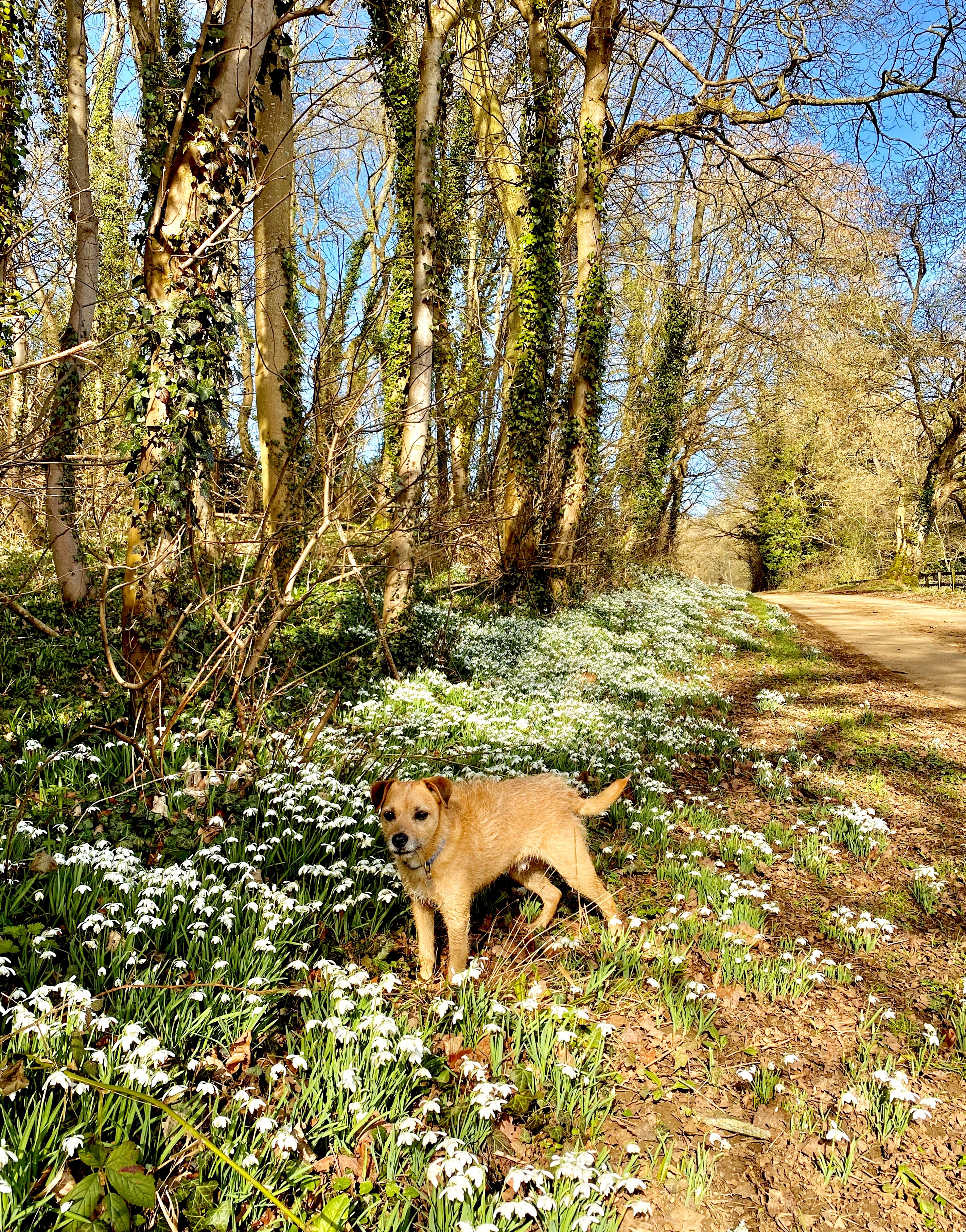 Dizzy snoops out the snowdrops to welcome the first flowers of the year in January