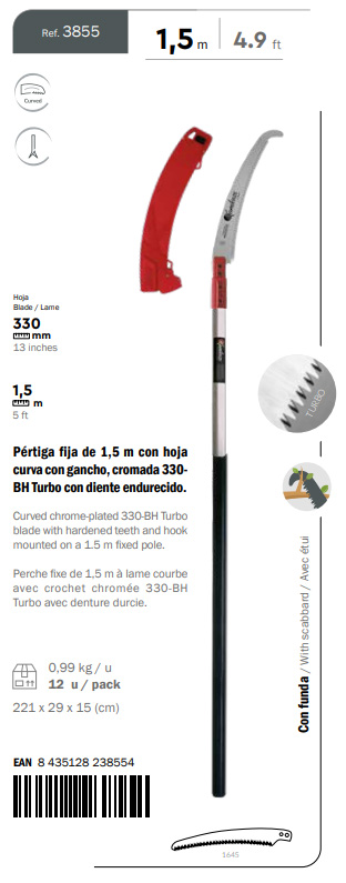 Suitable for the keen gardener and professional, this version of the long-reach 330-BH saw comprises a 33cm curved, chrome-plated blade with hardened teeth and branch hook mounted on a 1.5 metre fixed pole.
